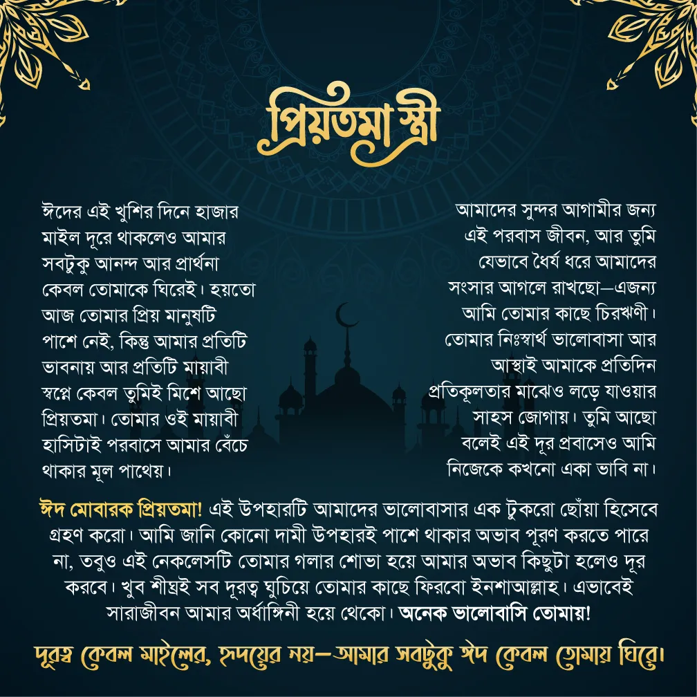 • আবেগঘন মেসেজ কার্ড: সুন্দর করে লেখা একটি কাস্টমাইজড মেসেজ কার্ড, যেখানে প্রবাস জীবন এবং স্ত্রীর প্রতি ভালোবাসার কথাগুলো চমৎকারভাবে ফুটে উঠেছে।